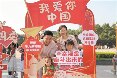 10月1日,在贺州市贺州广场,市民在“我爱你中国”打卡点合影,表达对祖国的热爱之情。聂志成 摄