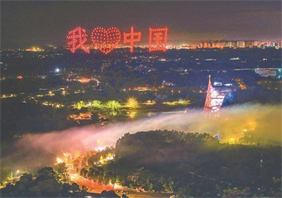 10月1日,在南宁市邕江边,一场无人机表演秀为国庆佳节营造浓厚氛围。周军 摄