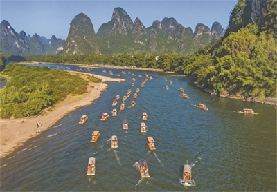 清晨的漓江,随着第一支竹篙划破平静的水面,成百上千艘竹筏载着全国各地慕名而来的游客驶离码头,漓江上再现“千筏竞流”的盛景。