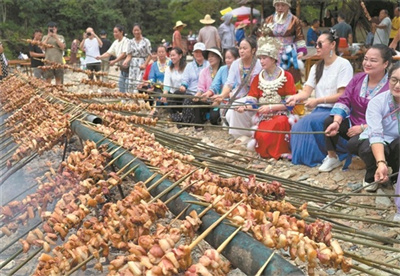 10月3日,柳州市融水苗族自治县安太乡元宝村整朵苗寨举行大型烧烤活动,吸引各地游人纷至沓来。龙涛 摄