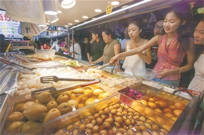 10月5日,在柳州市风情港夜市,游客在品尝广西特色小吃酸嘢。韦雨函 摄