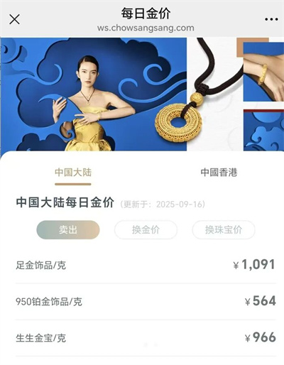 9月16日,周生生足金饰品价格报1091元/克,较前一日上涨17元/克;周大福、六福珠宝足金饰品价格升至1087元/克。