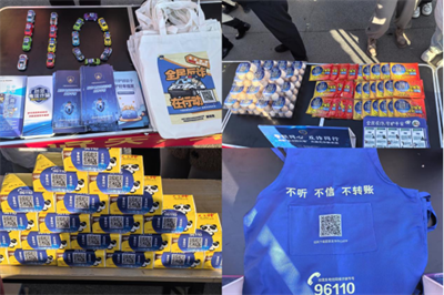 活动现场,布置精心、亮点纷呈。承办双方通过设置摆放宣传展板、咨询台、反诈知识趣味打点卡、发放反诈宣传手册、宣传单及印有反诈元素的宣传礼品等多个功能区域,全方位开展宣传工作。宣传活动筹备了丰富的宣传物料,不仅有反诈宣传手册、宣传单页,还有印有反诈标志、96110 反诈专线、国家反诈中心APP二维码的定制礼品,包括围裙、手提袋、马甲等实用物品。更具巧思的是,将反诈即时贴巧妙贴在鸡蛋、抽纸等日常用品上,还现场为老年人手机粘贴反诈标识,让反诈提醒融入生活场景,时刻敲响安全警钟。宣传过程中,银行工作人员通过案例展现工行在客户资金安全防护上的“第一道防线”作用,民辅警现场讲解反诈知识,开展有奖问答,并结合近期发生的典型诈骗案例,向过往群众深入浅出地讲解网络刷单、冒充公检法、虚假网络贷款等常见电信网络诈骗的诈骗套路与防范要点,反复强调“不听、不信、不转账”的核心反诈原则,叮嘱群众切勿随意透露个人身份信息、银行卡号及密码等敏感内容,遇到可疑情况第一时间拨打96110反诈专线联系警方。同时,宣传人员现场指导群众下载“国家反诈中心 APP”,逐一协助开启手机预警拦截功能,以技术赋能筑牢安全防护屏障,现场群众纷纷积极响应参与。