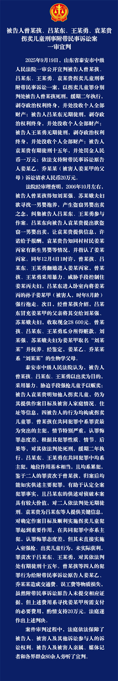 记者了解到,3月24日上午,山东省高级人民法院委托泰安市中级人民法院对“泰安入室抢婴案”进行二审宣判,依法裁定驳回上诉,维持原判,核准以拐卖儿童罪判处被告人曾某某死刑,缓期二年执行,剥夺政治权利终身,并处没收个人全部财产。