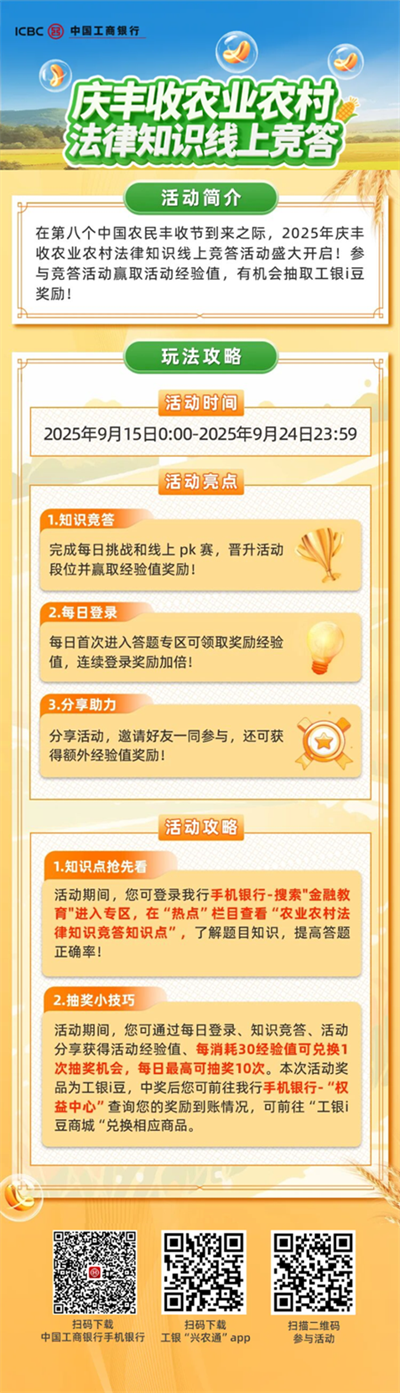 【答题】庆丰收农业农村法律知识线上竞答,赢最高3万工银i豆!